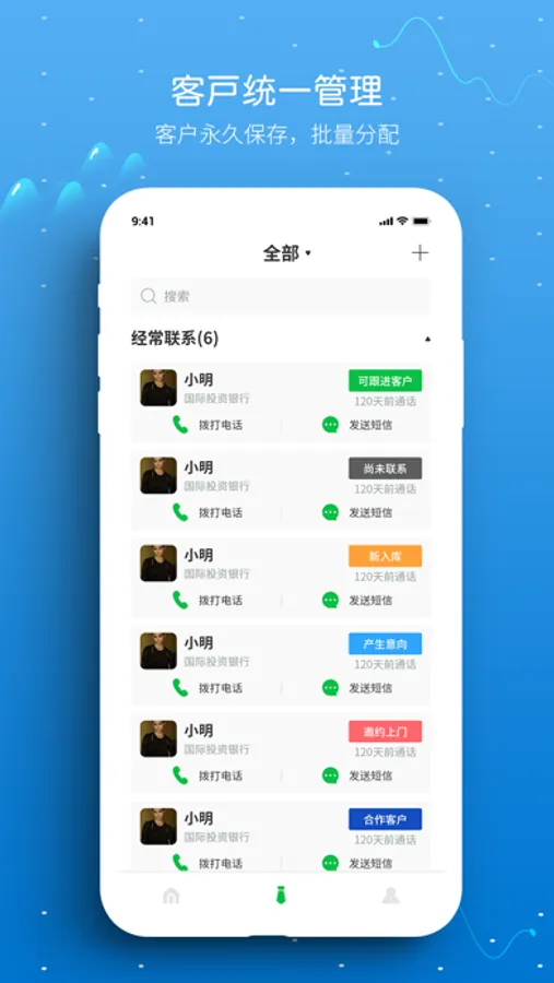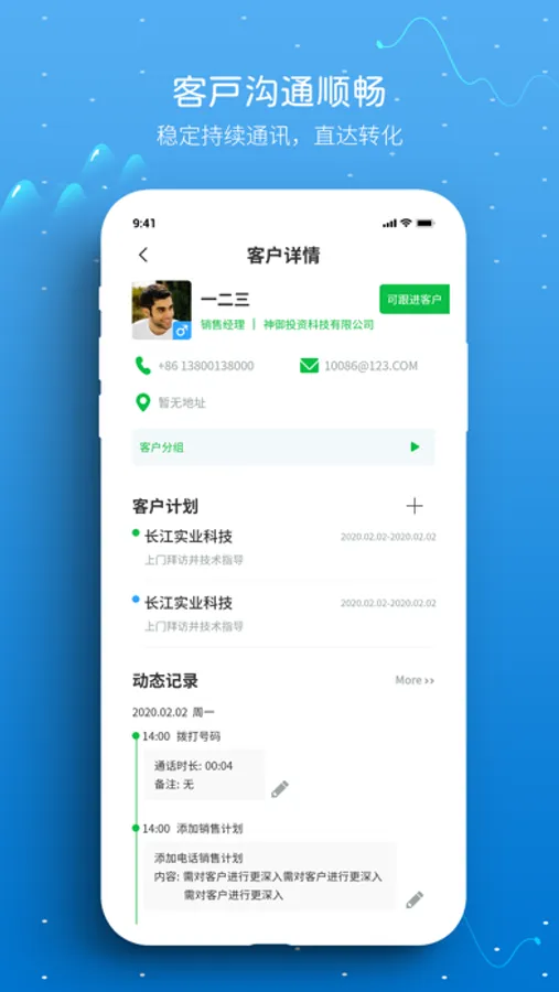通话录音全程自动保存,通话记录永久跟随客户,通话线路稳定,不会中断,短信触达率高,拜访轨迹可寻,是新一代的销售神器。