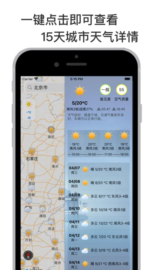 -专业技术和庞大的气象数据。根据导航路线显示途径城市15天天气预报,为您的长途旅程保驾护航。