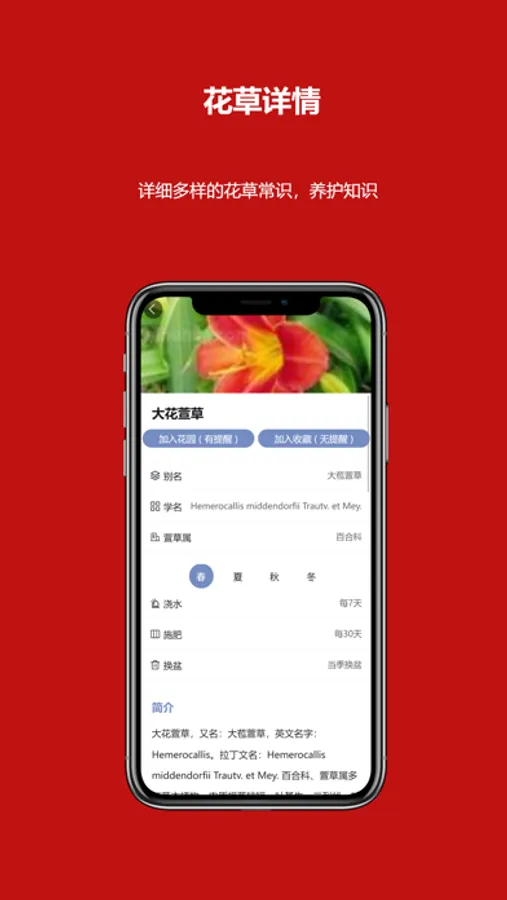 3.大量的专业植物资料:包含多肉、花草等各种数千种植物的详细信息、养护指南、生活习性等。教你如何辨别各种植物,可搜索自己喜欢的植物资料加入收藏。