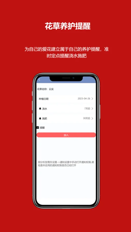 4.智能养护提醒:根据不同植物特性、不同季节、当地天气、养护方式来个性化提醒浇水、施肥、修剪、繁殖等养护需求。对于有经验的养护者可自己设定个性化的提醒频率。
