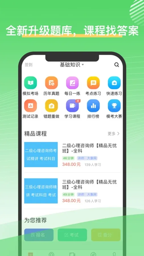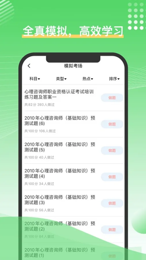 心理咨询师题库有模拟考场、历年真题练习、每日一练、快速练习、考点练习、考试押题、做题记录等多种学习与做题模式、丰富多样化的陪你一起考心理咨询师。