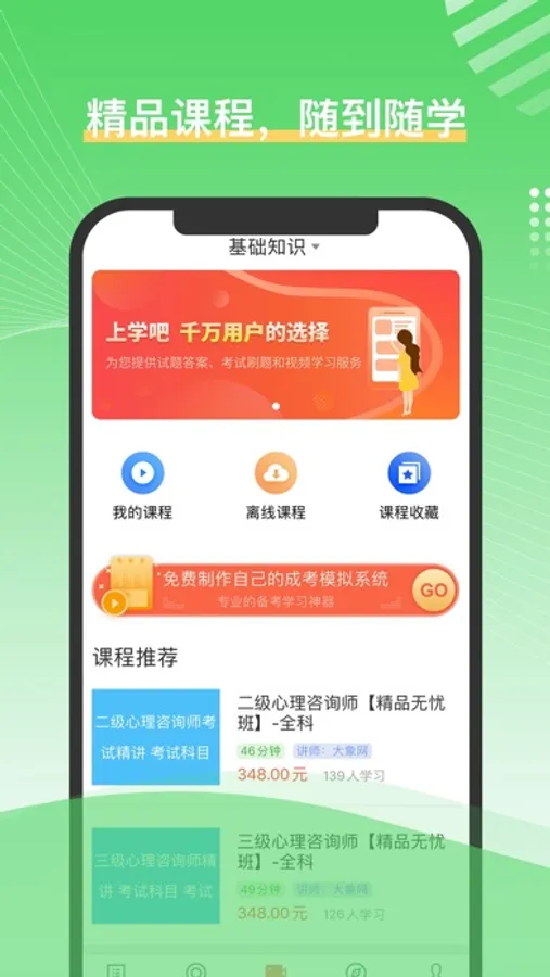 心理咨询师题库推出了专业的精选视频课程模块,精选心理咨询师培训课程,供您选择更生动的课堂的同时加快背题效率。课程支持离线下载,随时随地学习。