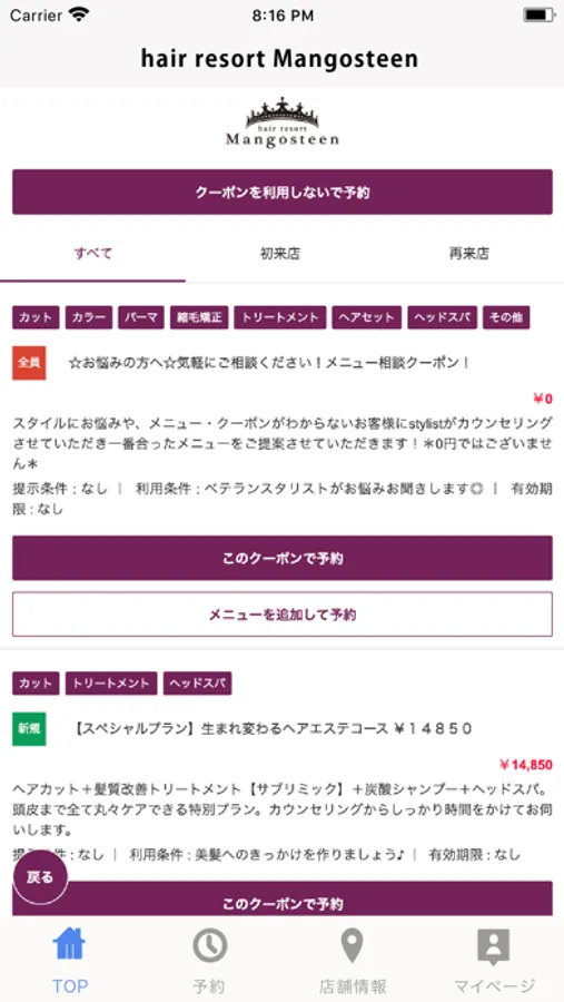 お得なクーポンが配信されます。ネット予約時にクーポン利用での予約も可能なので来店時もスムーズに施術頂けます。