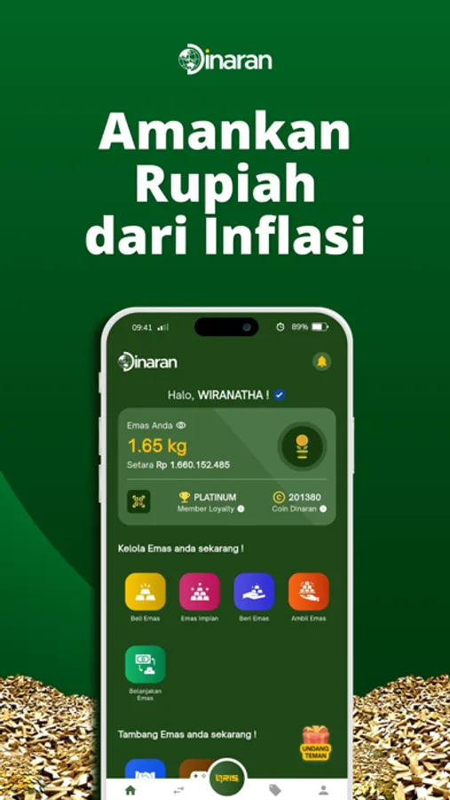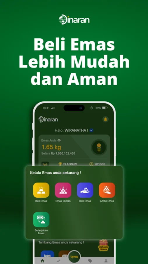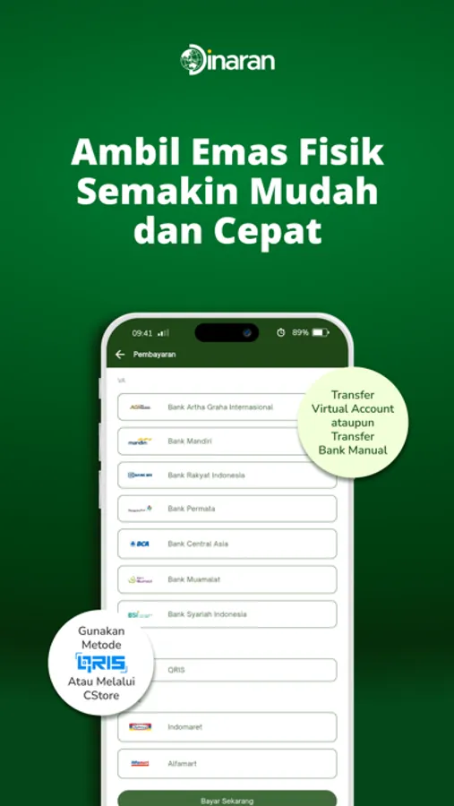Mari bergabung bersama kami dan nikmati layanan transaksi emas dengan cara baru sekarang. Aplikasi Dinaran membantu menjaga rupiah Anda dari inflasi, bertransaksi tanpa khawatir dengan fitur lengkap dan mudah hanya dalam 1 genggaman. Aplikasi Dinaran juga dilengkapi berbagai pilihan channel pembayaran yang memudahkan Anda bertransaksi.