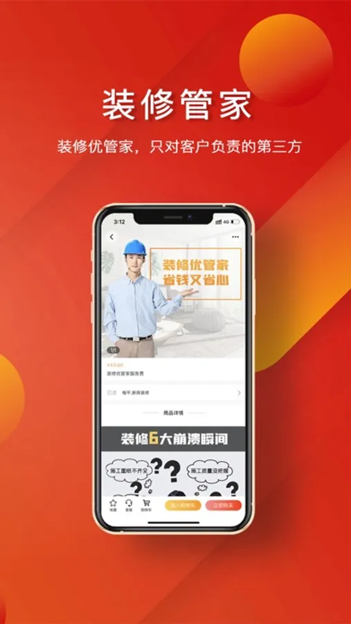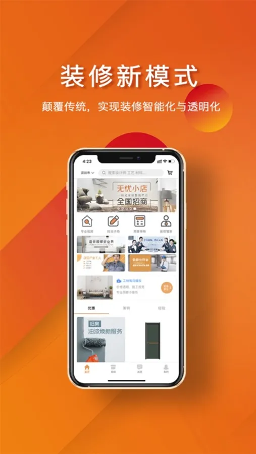 无忧装修APP融合设计师、装修管家及监理、产业工人,以及建材、家居等供应商资源,践行一切以客户满意为宗旨的服务理念,砍掉中间环节,业主智连工匠,通过平台统一、开放的施工标准体系和透明的价格机制,颠覆传统装修模式,实现智能化、透明化的过程管理,大大提升装修效率,降低整体装修花费,解决传统装修模式中“隐形增项多”、“施工不专业”、“工期延误”、“售后无保障”等诸多痛点,真正实现一站式的个性化无忧装修!