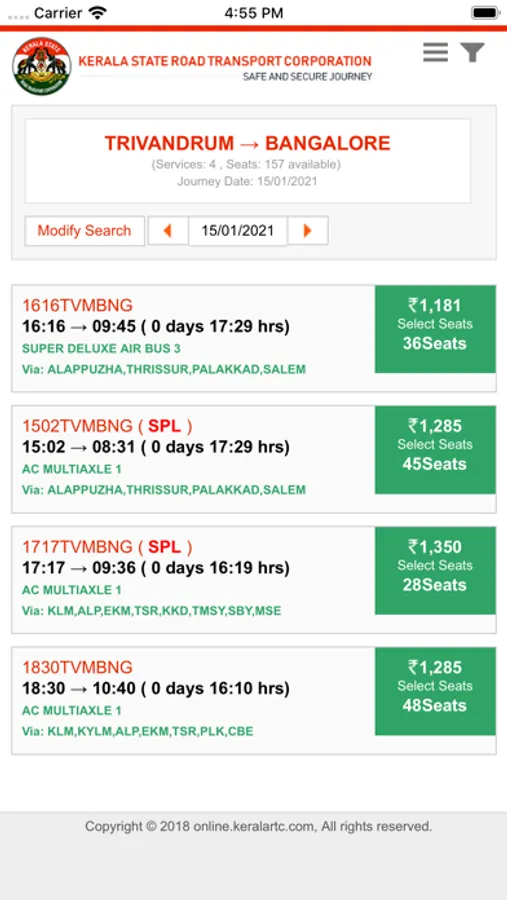 Kerala RTC is proud to introduce an online booking app "Ente KSRTC" at your finger tips. Kerala State Road Transport Corporation (KSRTC) is one of the oldest operated and managed public transports of India. Kerala RTC is committed to provide quality services and to improve services for utmost satisfaction of the passengers. If you have any suggestions or issues feel free to send your feedback to rsnksrtc@kerala.gov.in.
