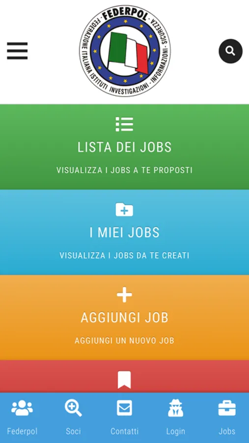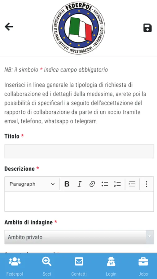 L’app conterrà la sezione esclusiva denominata Jobs (invio e ricezione di richieste di collaborazioni tra soci titolari Federpol) usufruibile solamente scaricando l’app ufficiale Federpol da Apple Store.