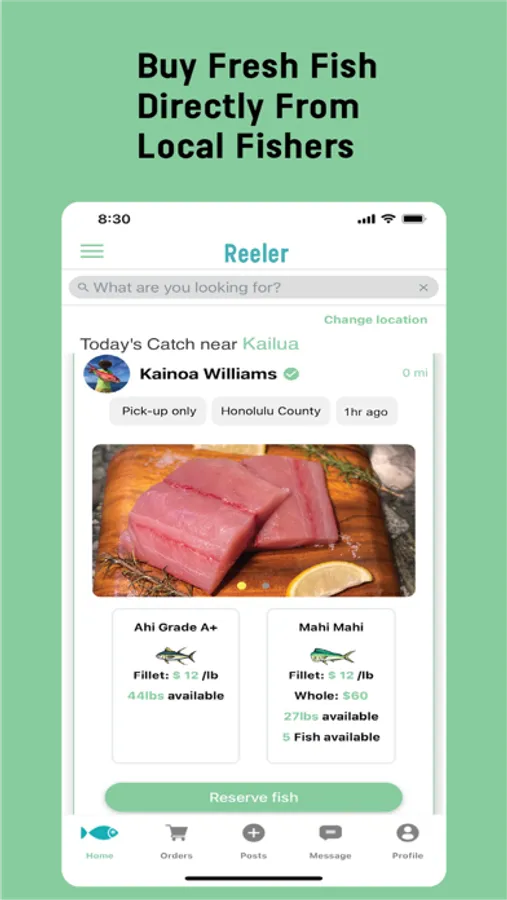 Get notified as soon as a fresh catch is posted by a fisherman in your area. Reserve your fish, get directions to your pickup location, then conveniently and securely pay in the app! You can also read and write reviews for each seller.