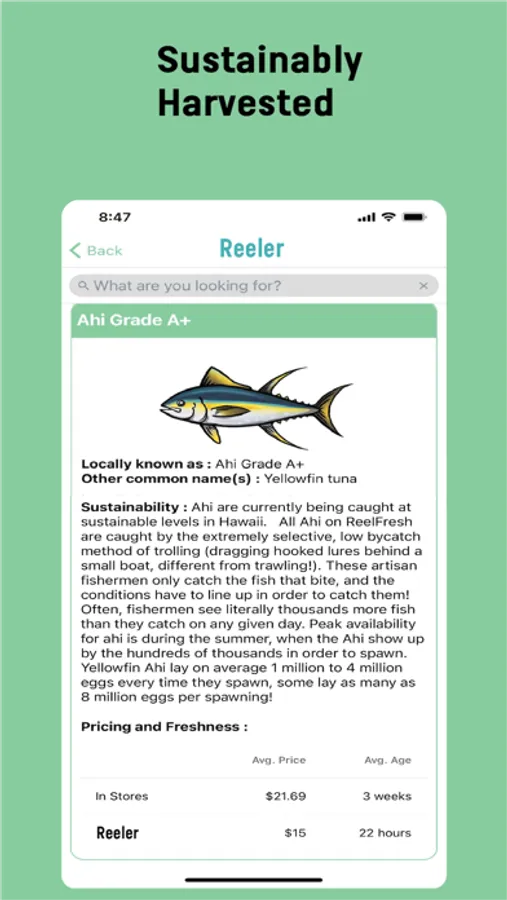 Feel confident that the fish you buy is truly sustainably caught, the most eco friendly way. Reeler only allows a small percentage of fishermen on our site, those who use exclusively the most sustainable eco friendly methods of fishing. Download now to see more about our stance on sustainability, and our commitment to zero bycatch!