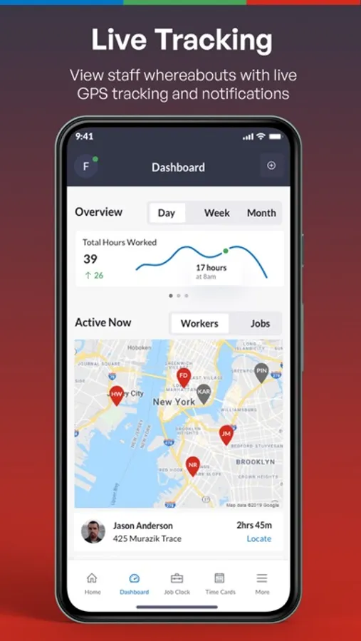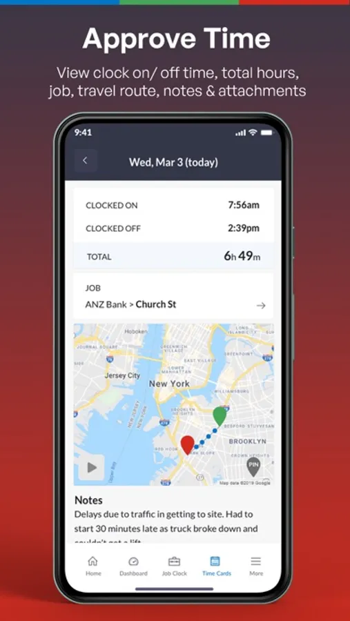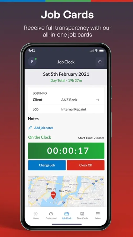 Team members can clock in and our from their phones, take breaks, be assigned jobs, lodge timesheets and receive approval by Managers. Managers can see who's active on the JCards live tracking map, including their vehicle speed and exact travel history. JCards holds employees accountable for their hours worked and allows business owners peace of mind when handling payroll and tracking business time and expenses.