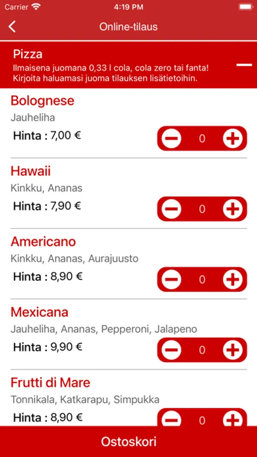 Tilaa pizzat ja kebabit noutona tai kotiinkuljetettuna. Tarjontaamme kuuluvat PIZZAT, KEBABIT, Pannupizza, Calzone, Rullat, Falafelit, Kanadönerit, Kanakorit, Salaatit ja JUOMAT.