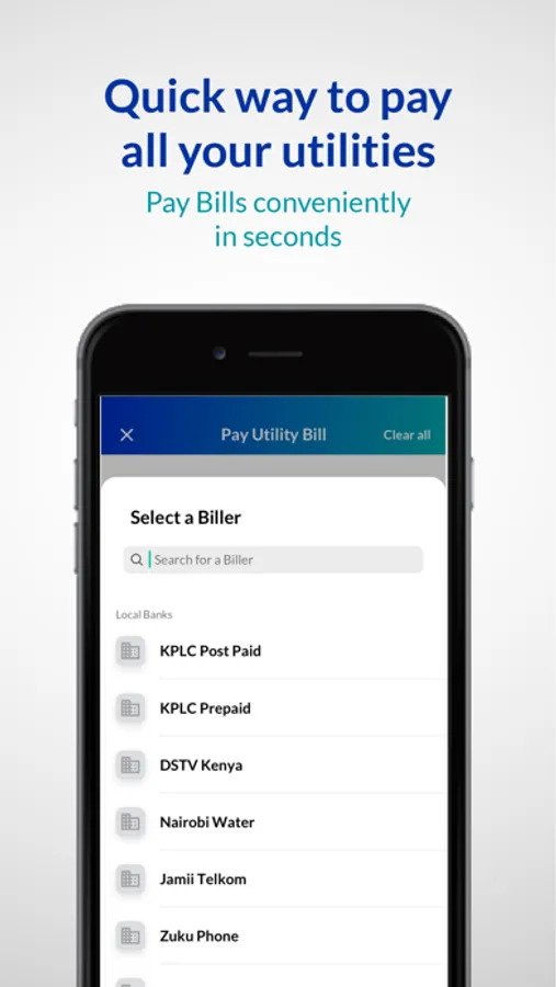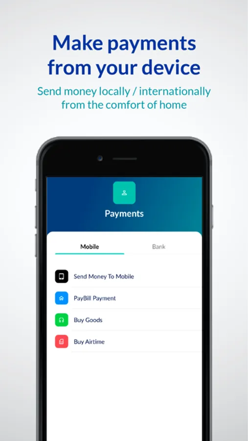 - Mobile money (Mpesa pay bill, till and airtime top-up)