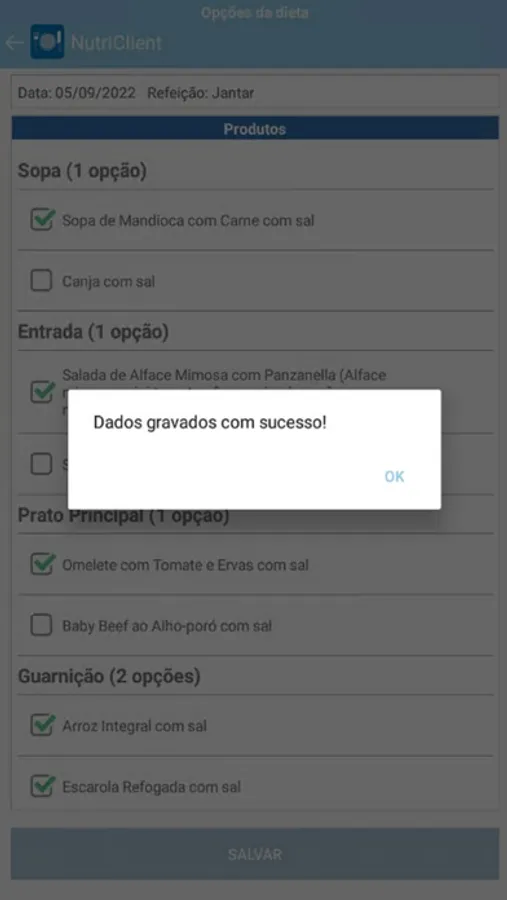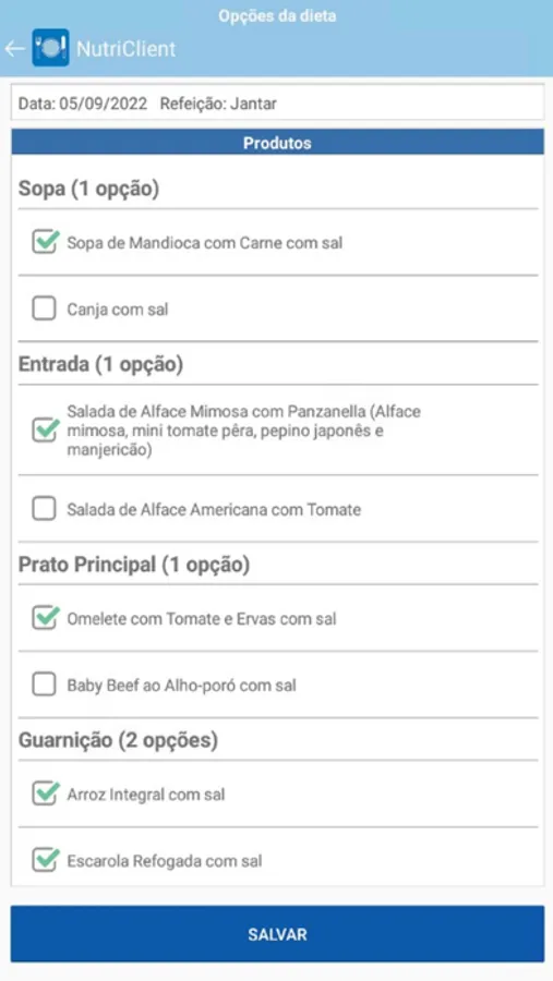 O cardápio tem uma opção previamente selecionada, como sugestão, mas permite a escolha livre de acordo com a preferência.