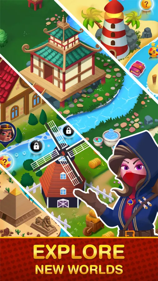 • Accumulate coins with each win, using them to unlock and venture through a plethora of diverse levels; from the serene farms to the buzzing atmosphere of Japan, perilous pirate lairs, rugged Western frontiers, mystic Egyptian tombs, and the elite high roller lounges.