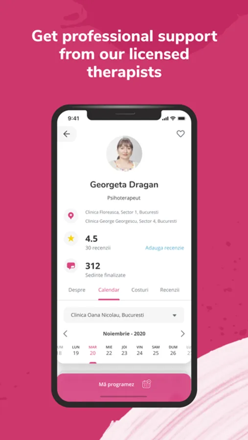 Puteți programa sesiunile de terapie de oriunde, oricând, fără a mai fi nevoie de pași suplimentari. Rezervați-vă sesiunea la ora care vi se potrivește cel mai bine, deoarece puteți vedea calendarul live al terapeuților noștri. Adăugați terapeuții la secțiunea Favorite, urmați programările și starea abonamentului, plătiți sesiunile de terapie online, primiți notificări despre următoarea dvs. sesiune și rămâneți la curent cu toate noutățile noastre.