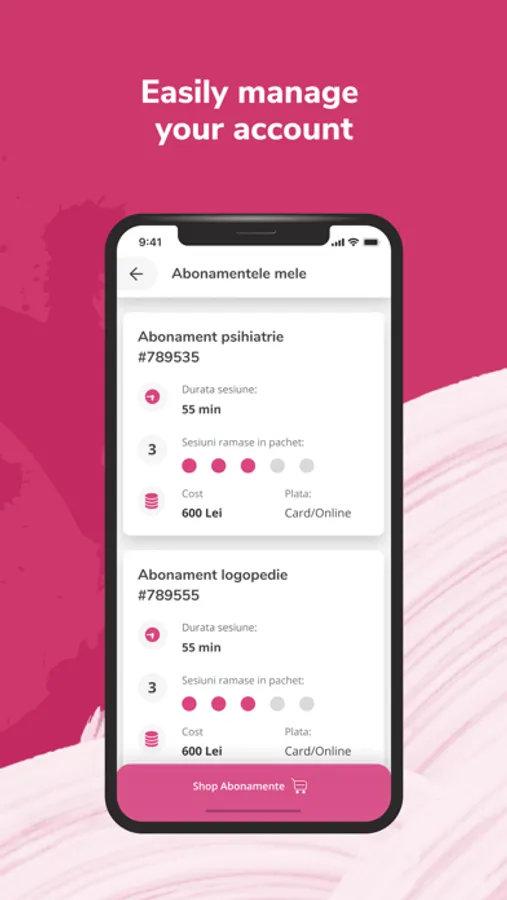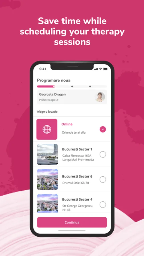 Pentru că aveți acces la programul terapeuților noștri, puteți rezerva ora pentru ședința de psihoterapie în intervalul care vi se potrivește cel mai bine. Puteți să adăugați terapeuții la secțiunea Favorite, să urmăriți programările și starea abonamentelor, să plătiți sesiunile de terapie online, să primiți notificări despre următoarele sesiuni și să fiți la curent cu noutățile.
