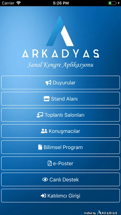 Arkadyas Sanal Kongresi'nin resmi aplikasyonudur. Bu aplikasyon ile kongre içeriklerine ulaşabilir, anlık güncelleme mesajları alabilir, kongre esnasında güncel bilArkadyas Sanal Kongresi'nin resmi aplikasyonudur. Bu aplikasyon ile kongre içeriklerine ulaşabilir, anlık güncelleme mesajları alabilir, kongre esnasında güncel bilgileri öğrenebilir, canlı yayınları izleyebilir, standlar ile görüşmeler yapabilirsiniz.Arkadyas Sanal Kongresi'nin resmi aplikasyonudur. Bu aplikasyon ile kongre içeriklerine ulaşabilir, anlık güncelleme mesajları alabilir, kongre esnasında güncel bilgileri öğrenebilirsiniz.