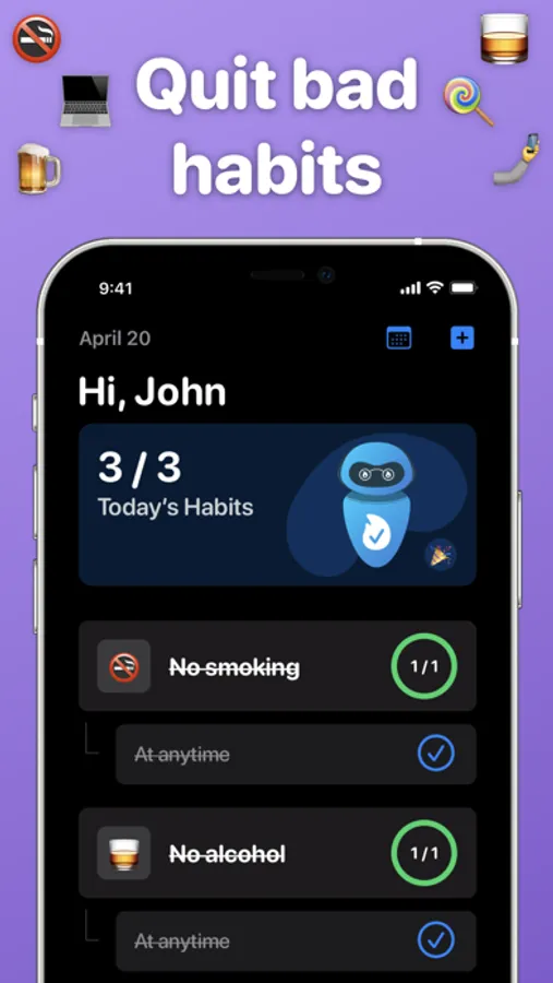 - Notifications. Smart reminders will help you stick and complete your habits.