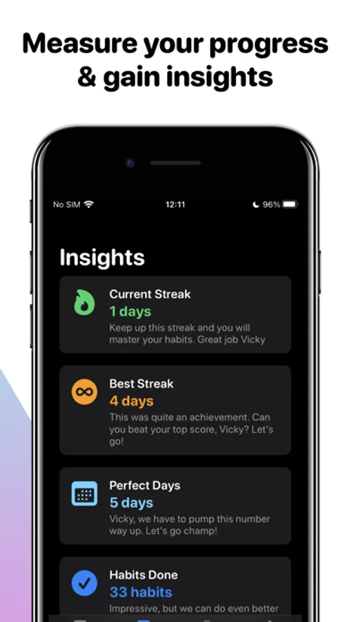 - Insights. Track your habits and analyze progress - build motivating chains of completed habits and perfect days. The longer your chain of completed habits, the more likely you will keep the streak going.