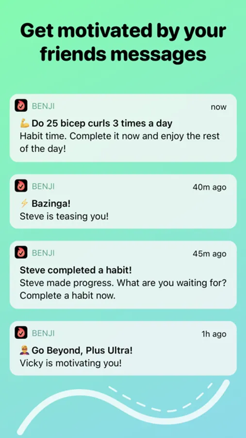 - Motivation. Benji will motivate you to complete your habits. You can also send and receive motivational messages from your friends.