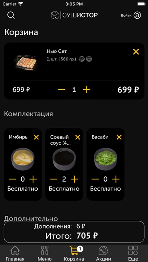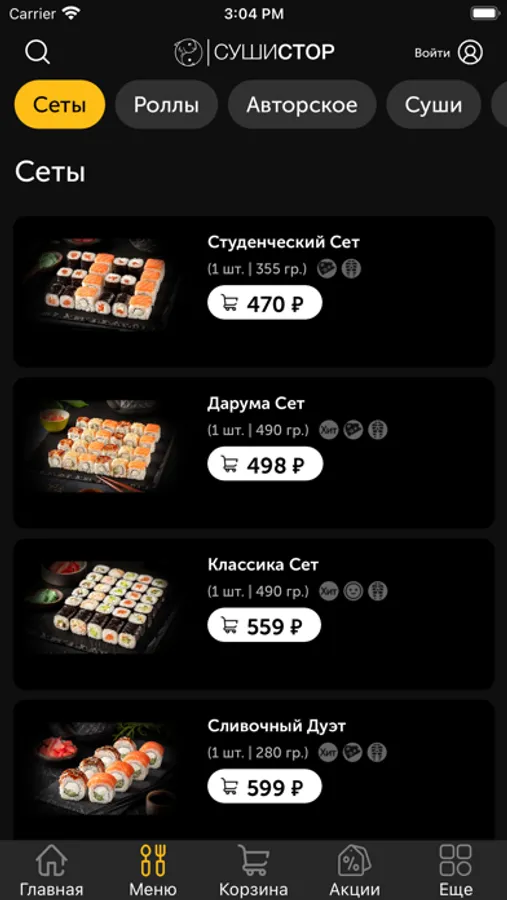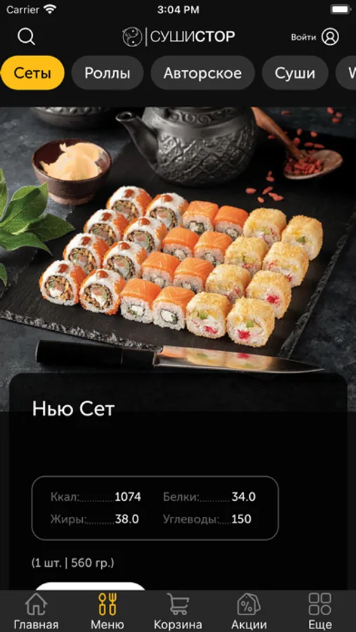 - большой выбор блюд на любой вкус: суши, роллы, сеты, лапша wok, рис wok, салаты и супы;