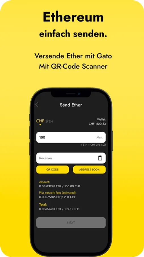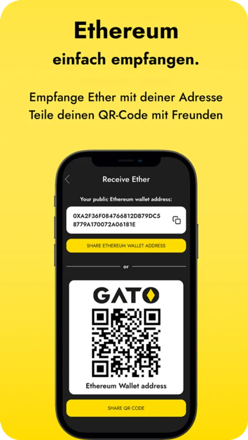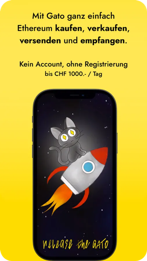 Keine unnötigen Funktionen und mühsame Registrierungsprozesse, einfach herunterladen und sofort Kaufen oder Verkaufen. Gato erlaubt es dir direkt von deinem Bankkonto Ether zu kaufen und zwischen deinen Freunden hin und her zu schicken. Du bist jederzeit in voller Kontrolle von deinen Ether und niemand sonst hat Zugang dazu!