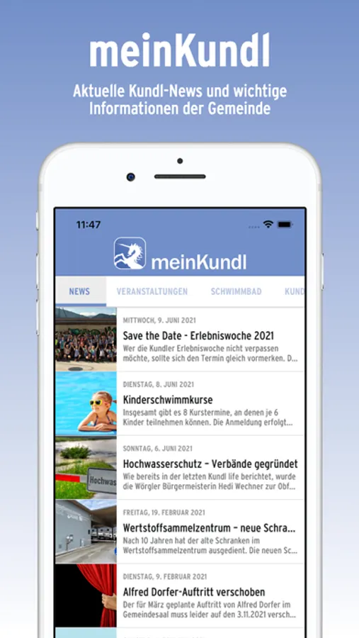 Sie möchten keine wichtigen Neuigkeiten der Gemeinde Kundl verpassen, haben aber zu wenig Zeit, sich täglich auf der Gemeindehomepage oder auf Facebook zu informieren? Dann ist die meinKundl-APP genau das Richtige!