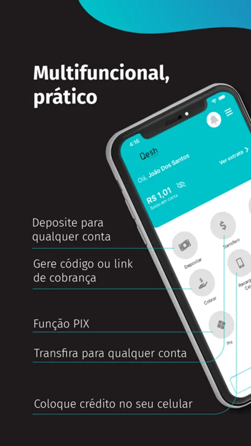 Ao criar a sua conta, você terá acesso a todos os serviços financeiros, tais como extrato, pagar contas, e cobrar alguém.