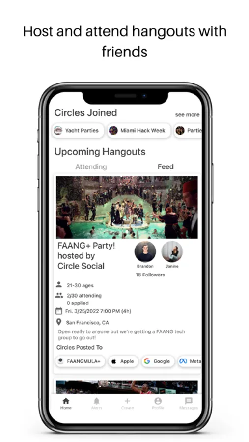 Circle Social connects people together. People create Hangouts (events, parties, pregames, etc.) and apply to attend other peoples’ Hangouts in Circles in their city. Circles can be anything from "BAYC", to "SF Parties & Pregames", to "FAANG+ Employees".