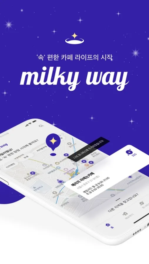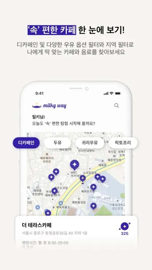 밀키웨이의 사용자, 밀키님의 현재 위치를 기반으로 맞춤 카페를 보여드릴게요.