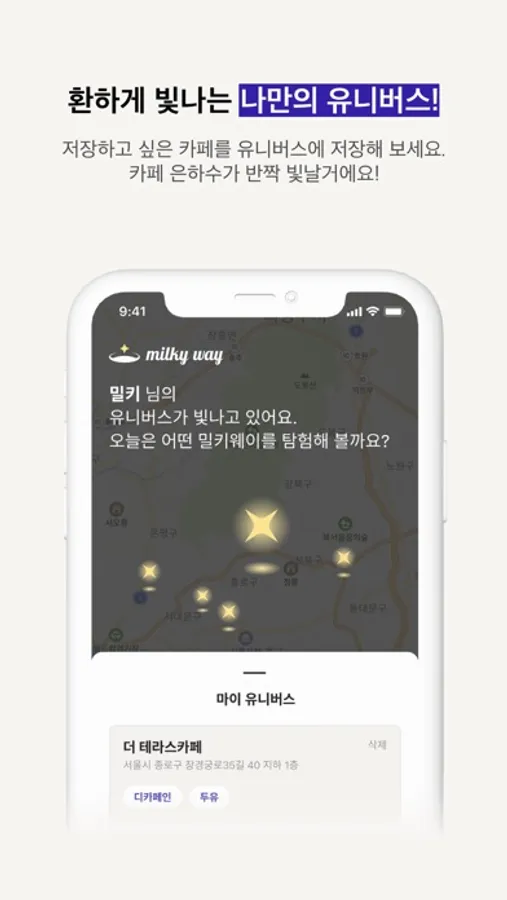 나의 취향에 맞는 카페를 유니버스에 등록할수록, 밀키님의 유니버스는 점점 더 환해질 거예요.