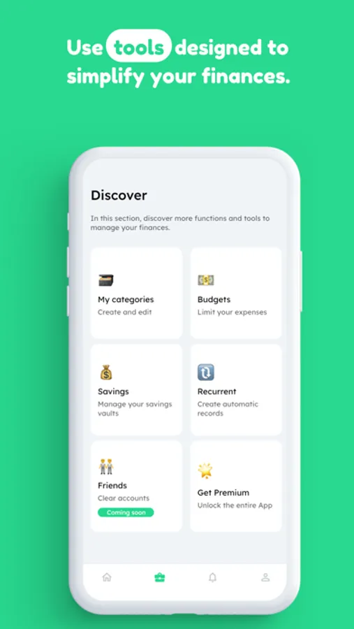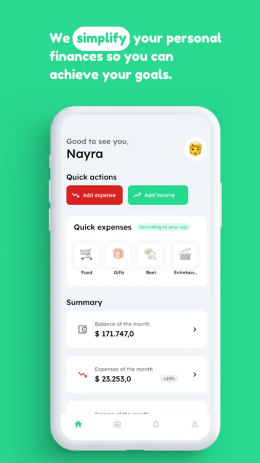 We know that savings are one of the most important aspects of personal finances. That's why we've created a function specifically designed for you to create and monitor your goals. As if that weren't enough, we'll help you stay focused on achieving them and defining them correctly.