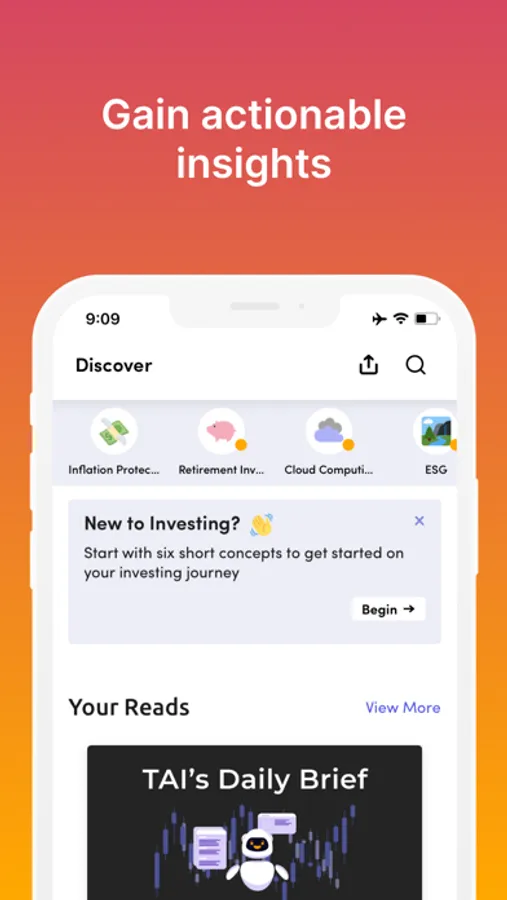 When you discover ETFs and stocks to follow, TAI's intelligent watchlists show you how a mock portfolio has performed in the past. Our market-weighting feature allows you to create balanced and diversified portfolios that you can use to inform your investment strategy.