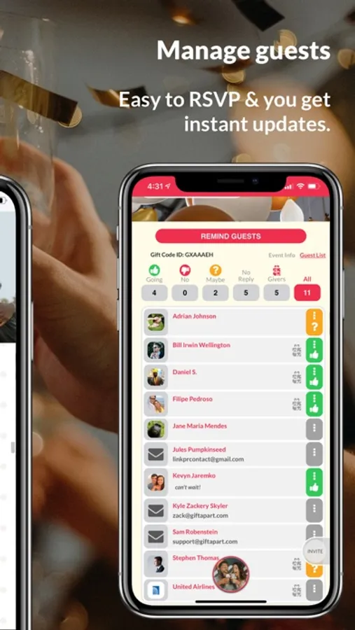 • Invite guests by email, social media, and more. Simply upload your contacts.
