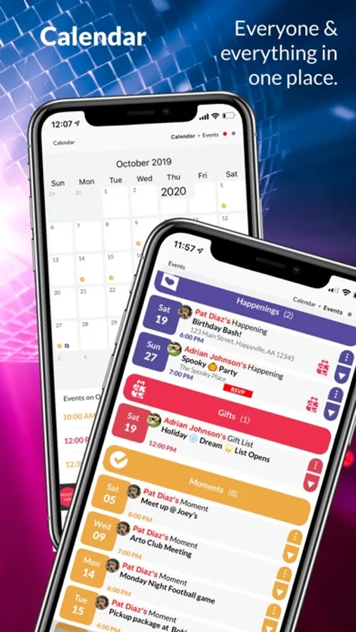 • Full calendar features built into Chatapart. Add and see Moments (everyday activities) and Happenings (events and parties). Plus see gift lists, store promos, friends’ birthdays, events and gift lists.