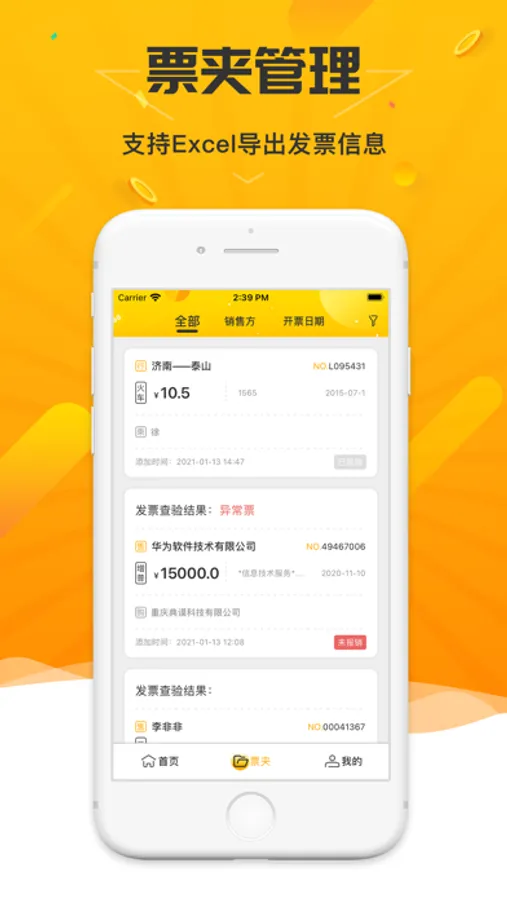 所有发票拍照导入后集中管理,发票信息状态一目了然