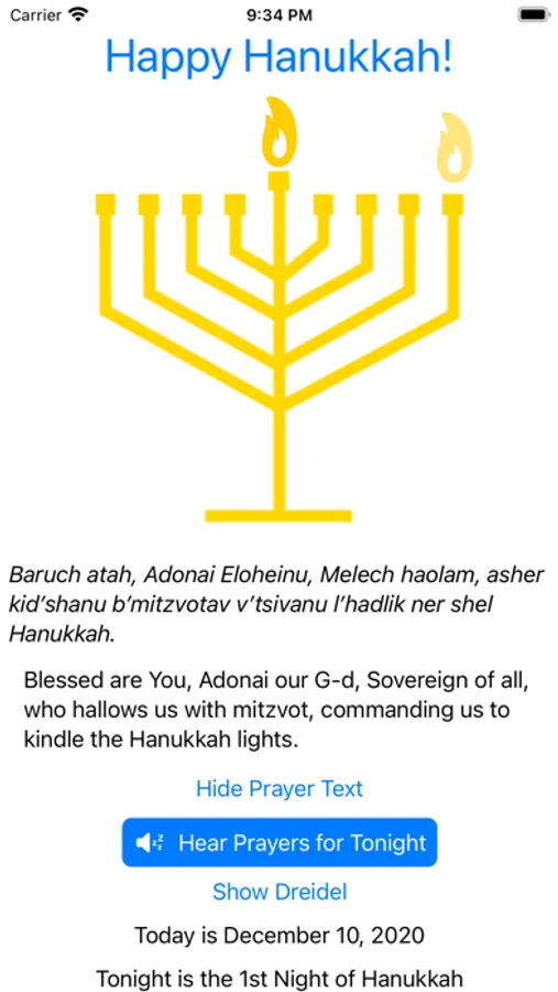 Ever lost track of which night of Hanukkah it is, just open the 8 Nights App to see a menorah showing you exactly how many candles to light. When it's not Hanukkah it will show you how many days are left until Hanukkah and lets you know when Hanukkah is. There is even a Dreidel game and the prayers. Hear them read or read them yourself. Also supports Dark Mode for those evenings spent basking in the light of the Menorah.