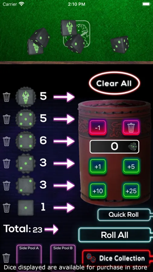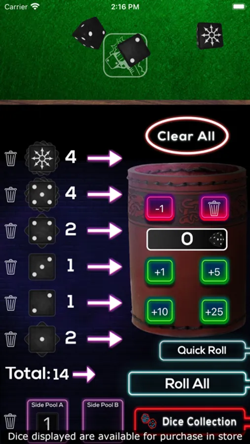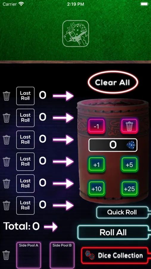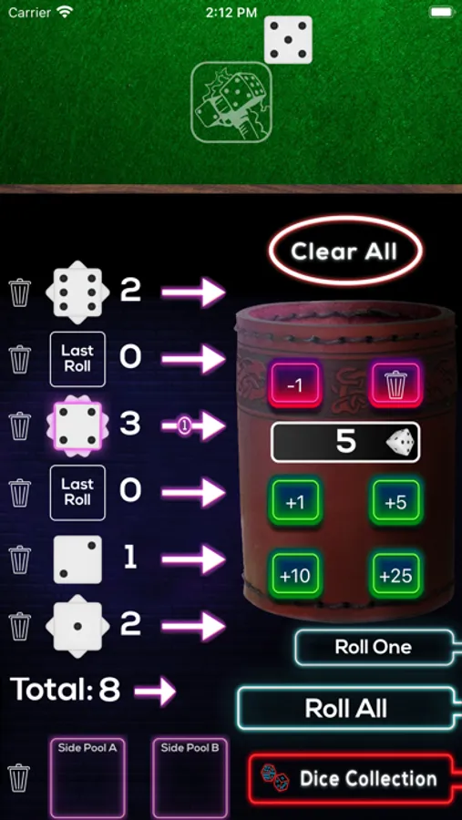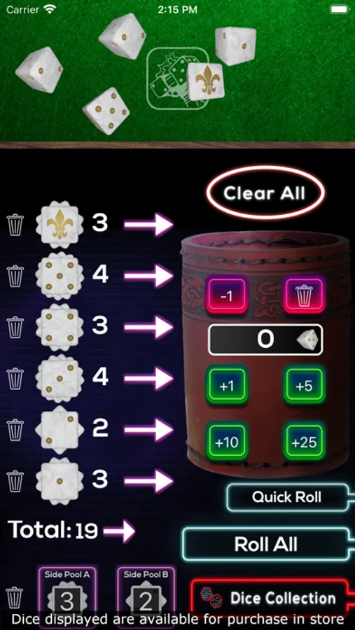 - Easy input for adding any amount of dice to the cup for rolling (no keyboard required).