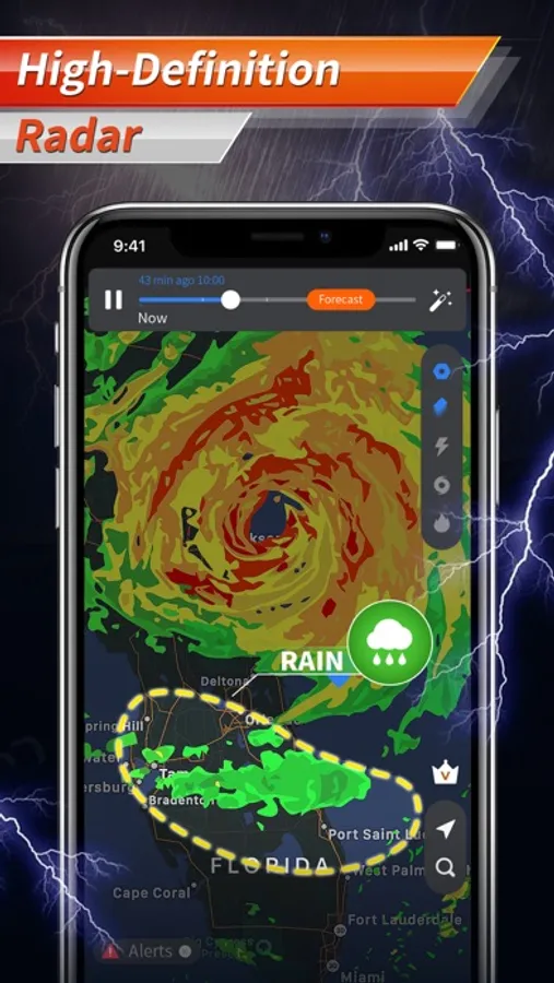 ●Animated real-time radar map overlay displays rain, snow, and mixed regions in high-definition and vibrant colors on the interactive map.