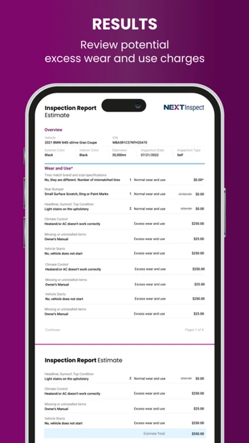NEXTInspect puts the power of a professional vehicle inspector in your hands and allows you to perform a pre-term vehicle inspection on your leased vehicle prior to turn-in. Powered by the same innovative technology used by dealers at lease-end today, you will be able to examine your vehicle’s condition for any potential excess wear and use. At the end of the inspection, you’ll have an idea of what fees, if any, you might expect to pay and have the opportunity to address necessary repairs before returning the vehicle.