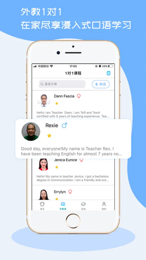 【严选外教】外教录取率不到5%,所有外教均拥有本科及以上高等教育背景,教学经验丰富,让您轻松进入全英文语言环境。