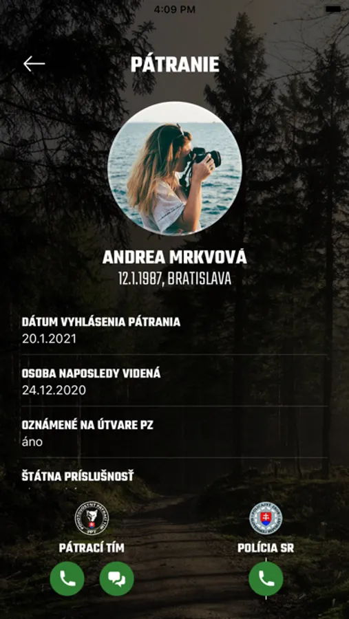 Po otvorení aplikácie sa Vám zobrazí fotografia a popis osoby s ďalšími informáciami. Ak ste osobu videli alebo práve vidíte niekde vo vašom okolí, sú Vám známe informácie, ktoré by mohli pomôcť pri pátraní, kliknutím na príslušné tlačidlo viete ihneď kontaktovať nás alebo políciu. Ak sa osoba nájde alebo bude pátranie ukončené, bude z aplikácie odstránená.
