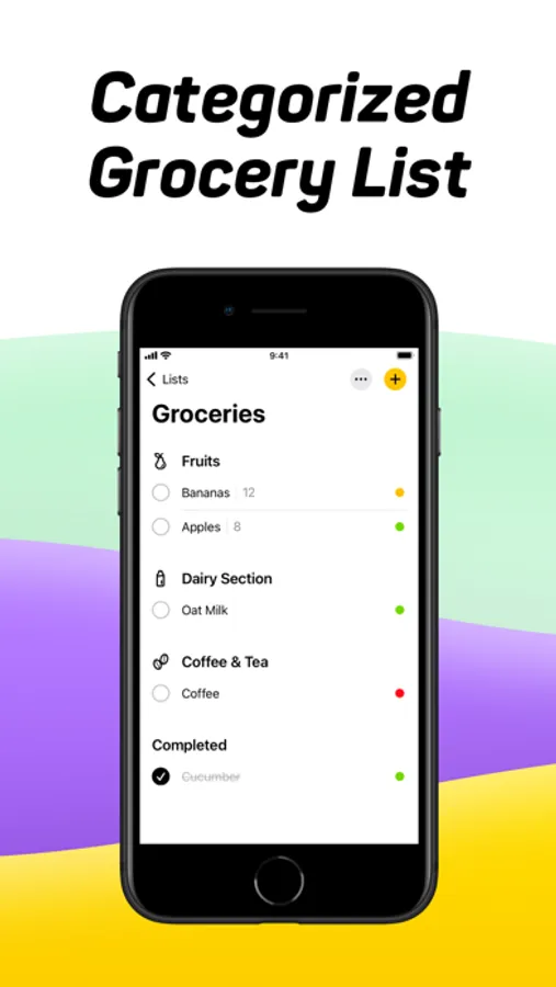 - Categorized List. Easily find your way around the store using the categorized grocery shopping list.