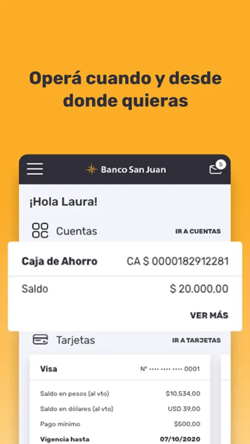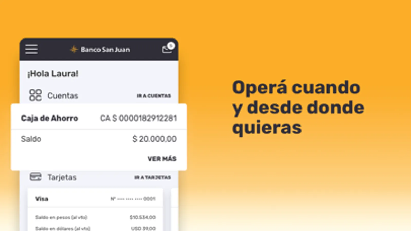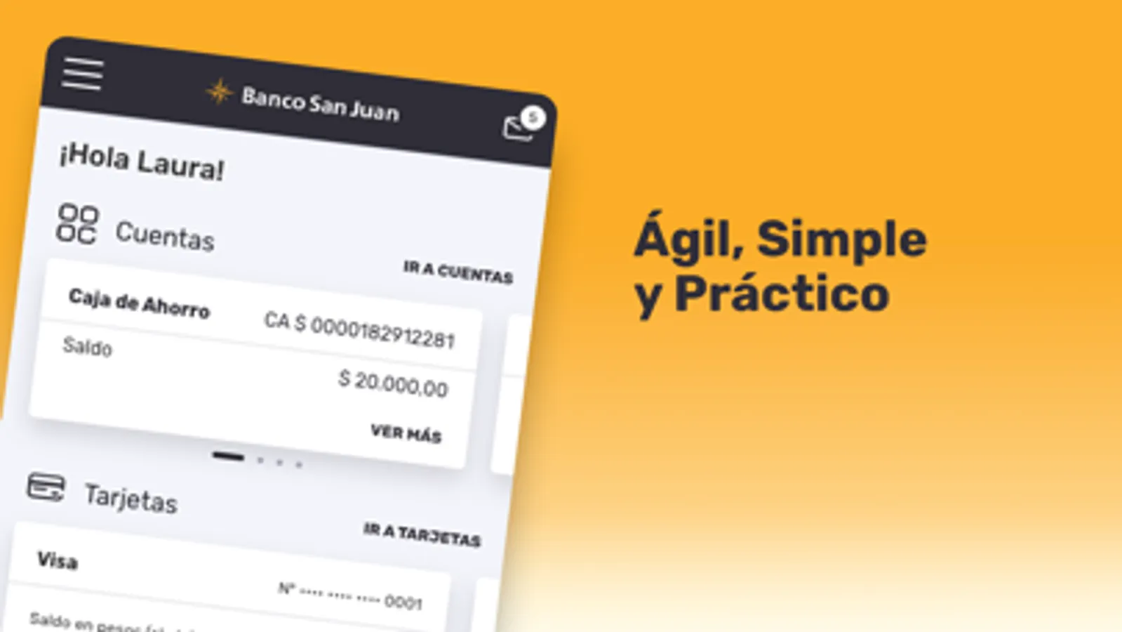 Conocé nuestro nueva App de Home Banking Banco San Juan. Ahora vas a poder realizar todas tus operaciones bancarias desde tu dispositivo móvil en cualquier momento del día sin importar dónde te encuentres. Pagá tus servicios, realizá transferencias, consultá tu saldo, concretá inversiones, encotrá los bancos más cercanos, todo esto y mucho más al alcance de tus manos. Presentamos una app dinámica y fácil de utilizar, que permite que aproveches tu tiempo libre en hacer lo que realmente te gusta, sin ningún tipo de preocupaciones. Nueva app de Home Banking, más ágil, simple y práctica.