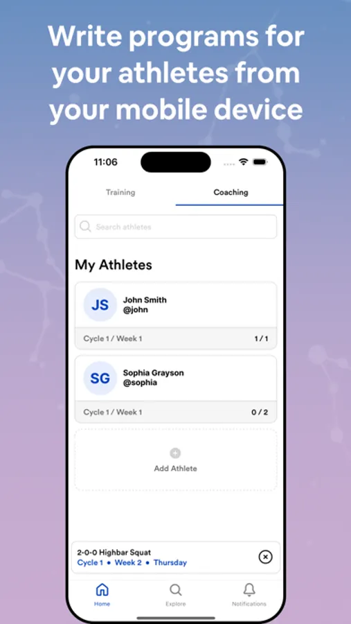 SquatLab allows you to connect with your coach or client, receive training programs and write training programs, and provide/view feedback on training sessions.