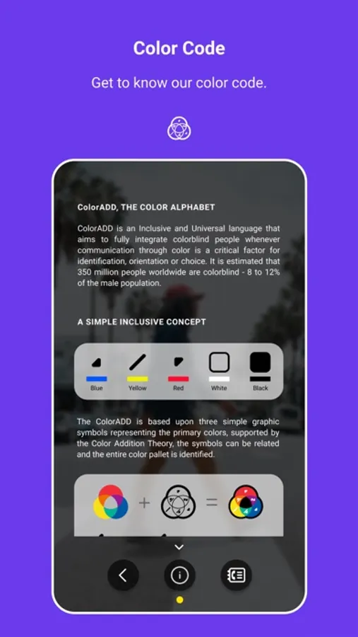Based on ColorADD's color alphabet, the ColorADD App is the ultimate on-the-go color tool for everyone. You can detect colors simply by pointing the phone camera to your objects or by uploading your images to the App.
