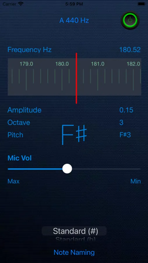 This tuning app also works as a pitch pipe and can sound a reference note to tune your instrument. Pitched Tuner displays a traditional tuner needle and dial. It clearly shows the frequency being played as well as the nearest note and error in cents. The dial then allows you to easily track small changes in pitch. A separate volume indicator tells you how clearly the microphone is picking up your instrument sound.