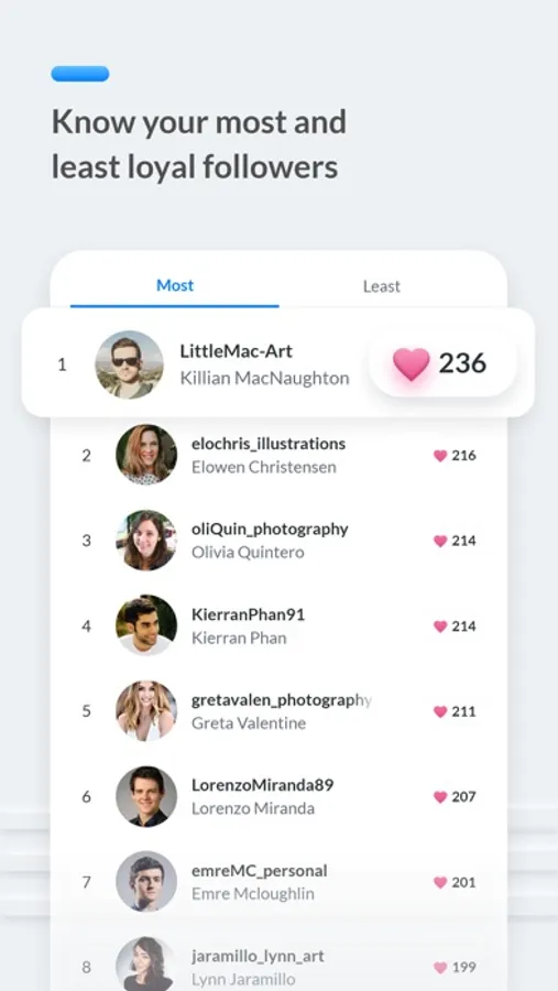 - Track your most loyal followers+ the amount of likes and comments they're giving you