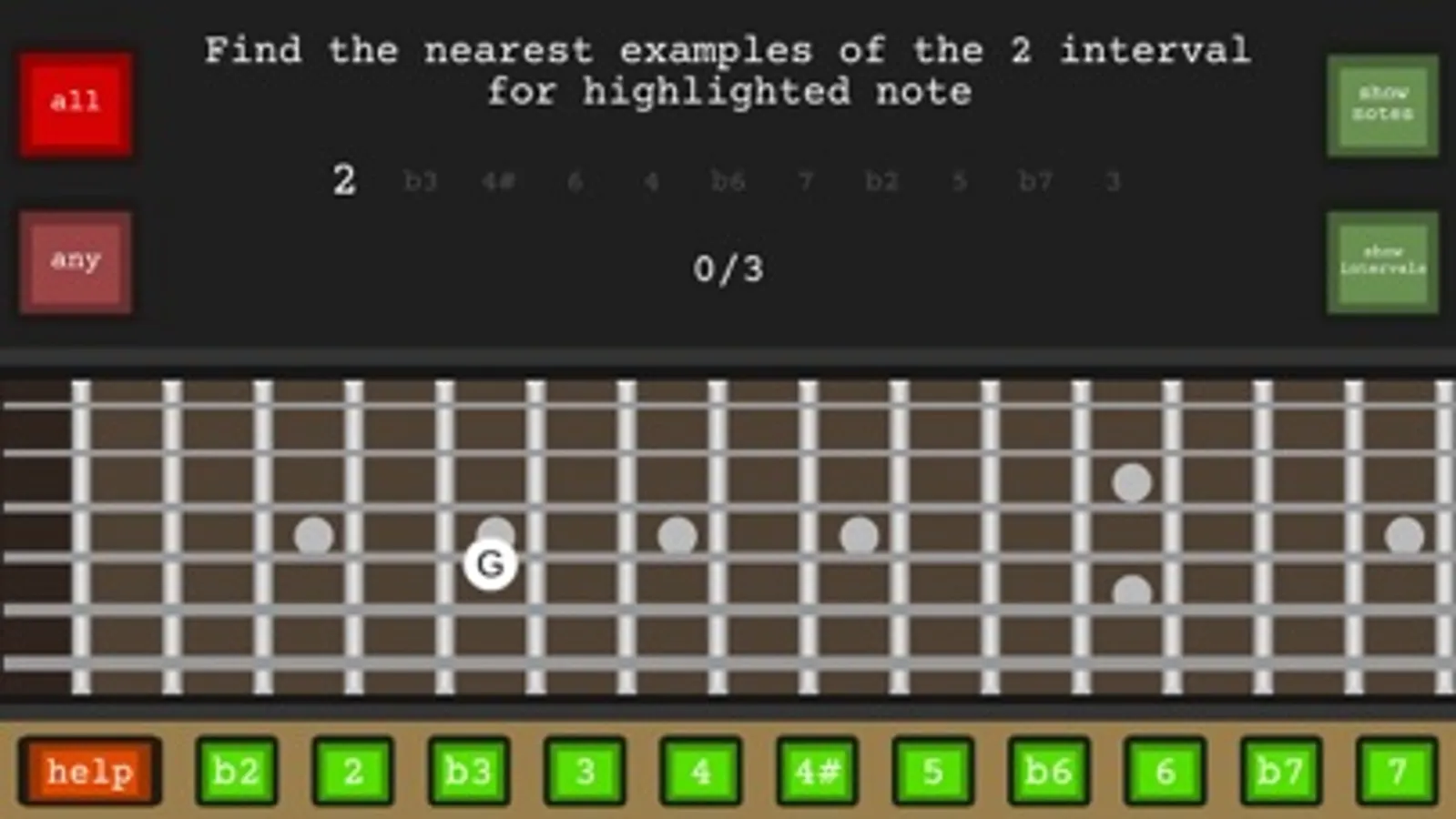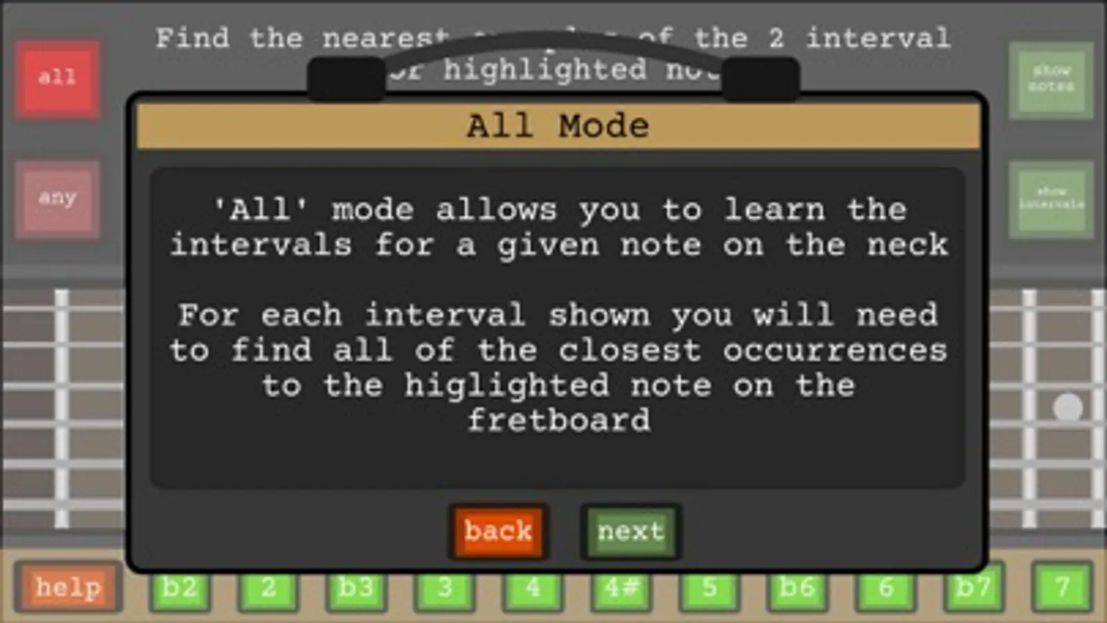 For example if you want to practice finding your "Seconds" and "Fiths" 'All' mode will pick a random note on the fretboard and ask you to find each occurrence.