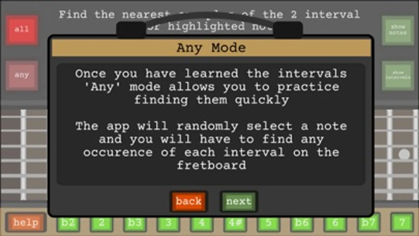 'All' mode is designed to help you learn and memorise the intervals shapes. The app will randomly choses a note on the fretboard and asks you to find all the surrounding interval positions from your selected practice intervals.
